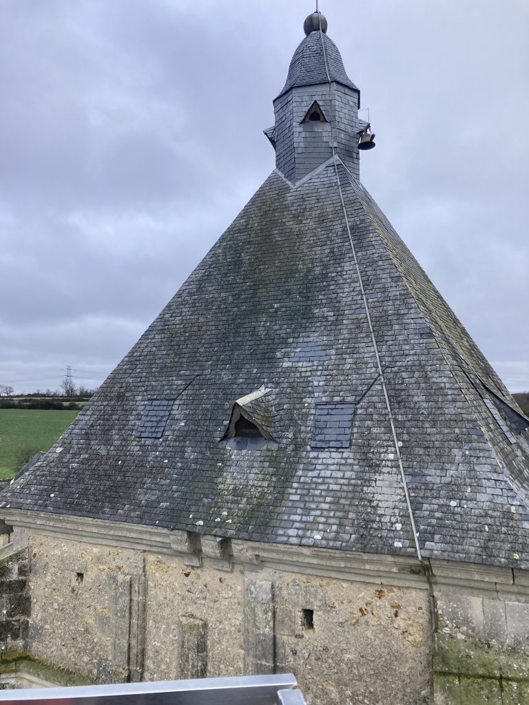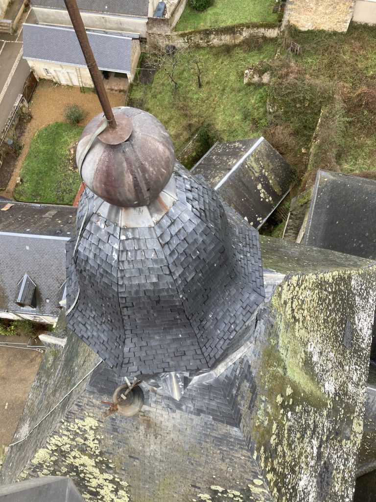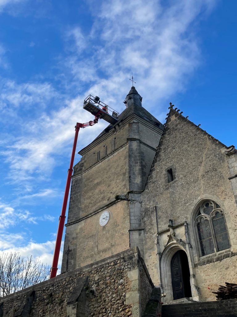 On a débuté l’année 2025 par la réparation de la toiture de la collégiale de Bueil-en-Touraine. Pour ce chantier nous avons fait appel à une nacelle de 40m pour plus de simplicité et de rapidité.